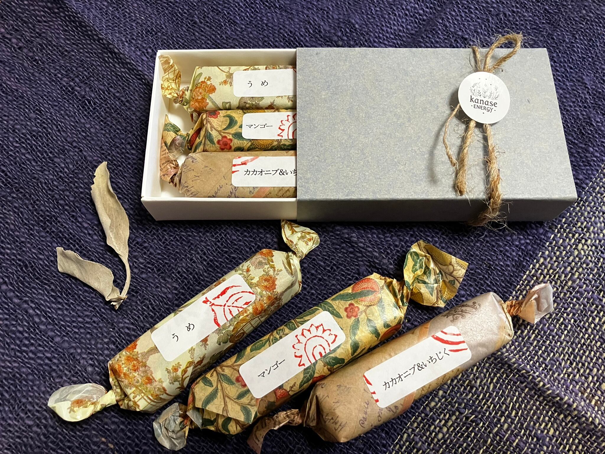 有機カシューナッツ、発酵小梅(kanaseの庭より)、発酵りんご(減農薬栽培りんご/kanaseによる発酵)、有機ドライマンゴー、ドライイチジク、ほか有機ドライフルーツ、有機カカオニブ、有機カカオパウダー、濱納豆